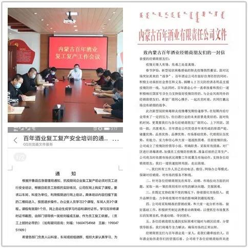 在抗疫特殊時(shí)期,百年酒業(yè)一直心系經(jīng)銷(xiāo)商朋友和全體員工。2月6日,分別發(fā)出百年酒業(yè)致全國(guó)經(jīng)銷(xiāo)商朋友、致全體員工的一封信,鼓勵(lì)大家堅(jiān)定抗疫勝利信心,做好防護(hù),在這場(chǎng)沒(méi)有硝煙的戰(zhàn)斗中,百年酒業(yè)一直在行動(dòng),百年酒業(yè)全體員工與經(jīng)銷(xiāo)商朋友一直在努力。根據(jù)公司的部署安排,通過(guò)電子辦公平臺(tái)、電話(huà)、微信、QQ群、釘釘?shù)确绞饺珕T進(jìn)行學(xué)習(xí)《疫情防控科普知識(shí)》、《公司2020年?duì)I銷(xiāo)生產(chǎn)行動(dòng)綱要》、《安全生產(chǎn)知識(shí)》等培訓(xùn),并充分做好復(fù)工復(fù)產(chǎn)準(zhǔn)備工作。